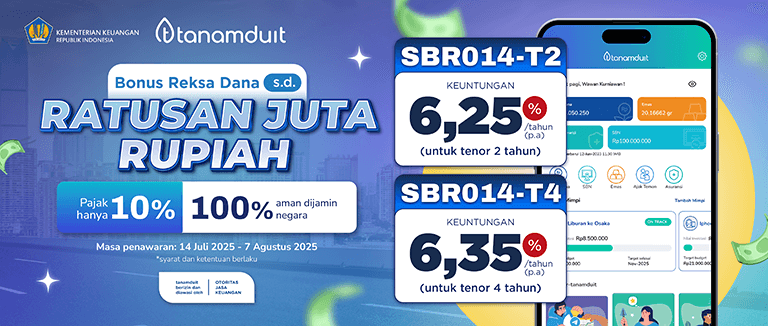 SBN seri SBR014 resmi rilis dengan jenis kupon floating with floor sebesar 6,25%/tahun (SBR014-T2) dan 6,35%/tahun (SBR014-T4). Kamu dapat membelinya pada masa penawaran 14 Juli—7 Agustus 2025. Raih kesempatan memperoleh promo menarik dengan berinvestasi SBR014 di tanamduit!