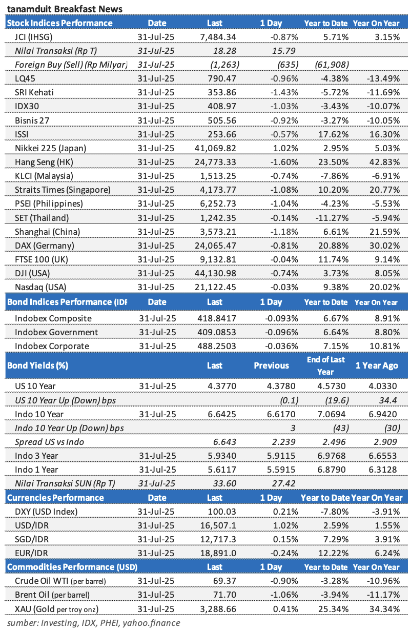 Berikut adalah data-data indeks saham, nilai tukar mata uang, harga komoditas, dan yield obligasi per tanggal 31 Juli 2025.
