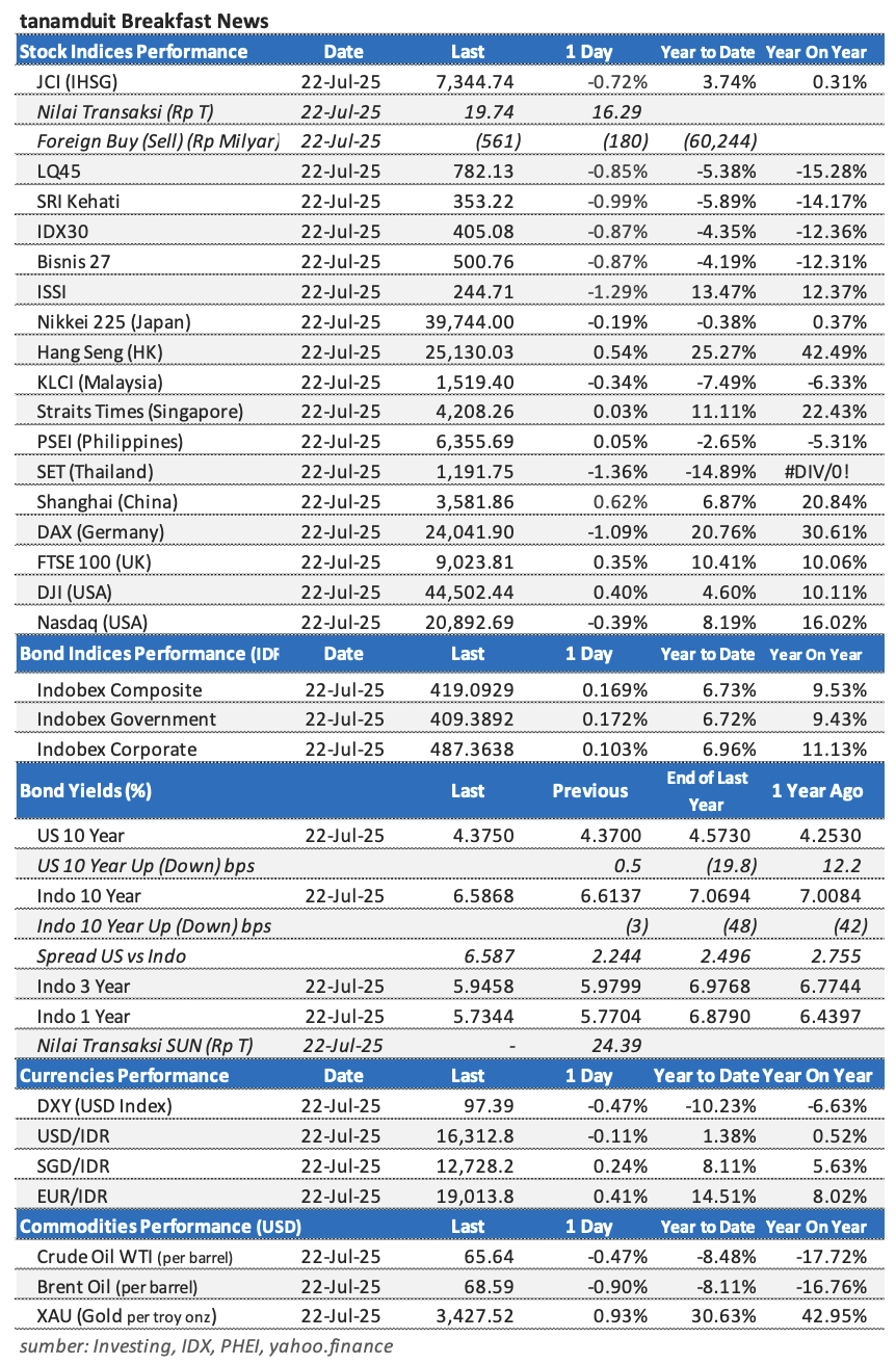Berikut adalah data-data indeks saham, nilai tukar mata uang, harga komoditas, dan yield obligasi per tanggal 22 Juli 2025.