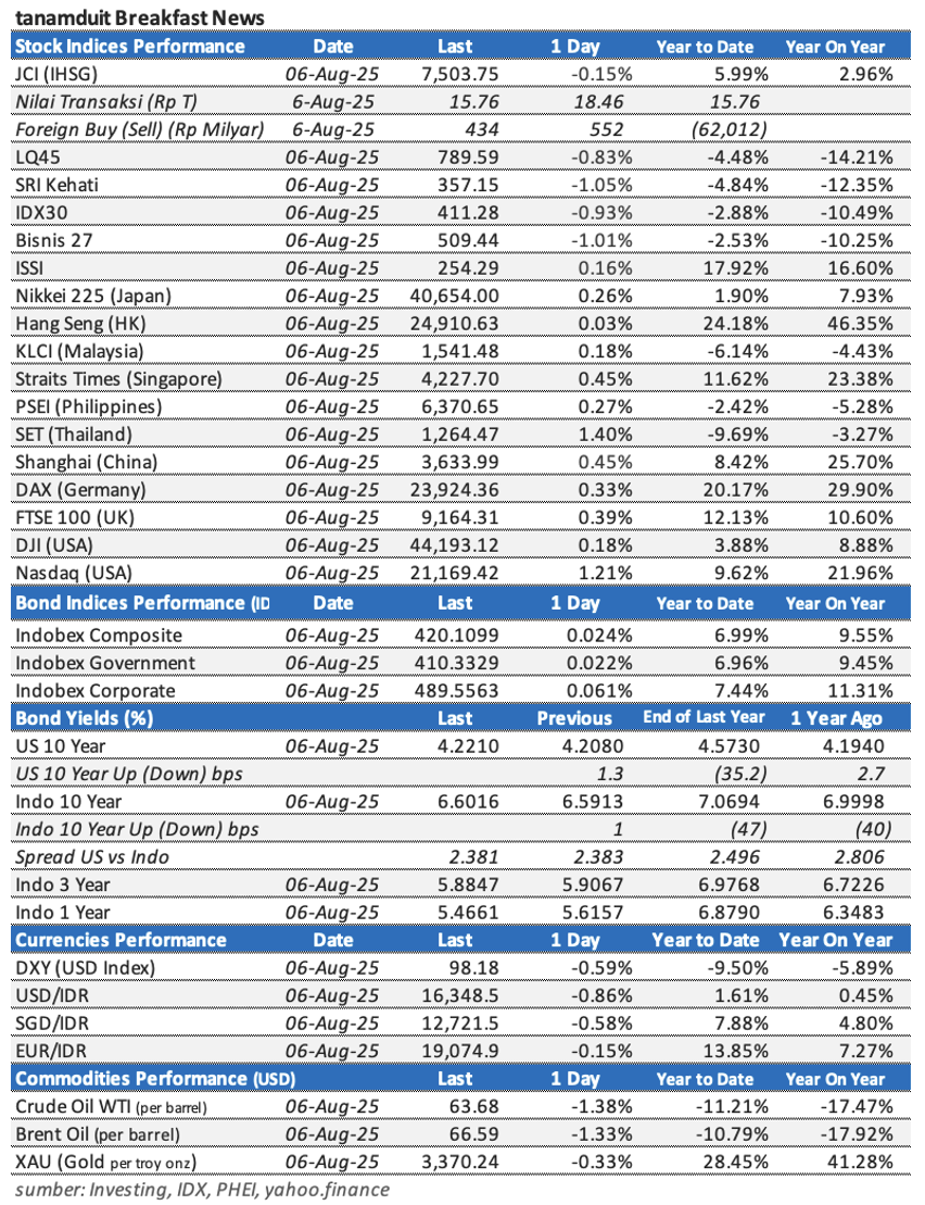 Berikut adalah data-data indeks saham, nilai tukar mata uang, harga komoditas, dan yield obligasi per tanggal 6 Agustus 2025.