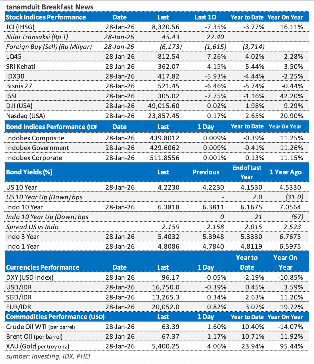 Berikut adalah data-data indeks saham, nilai tukar mata uang, harga komoditas, dan yield obligasi per tanggal 29 Januari 2026.