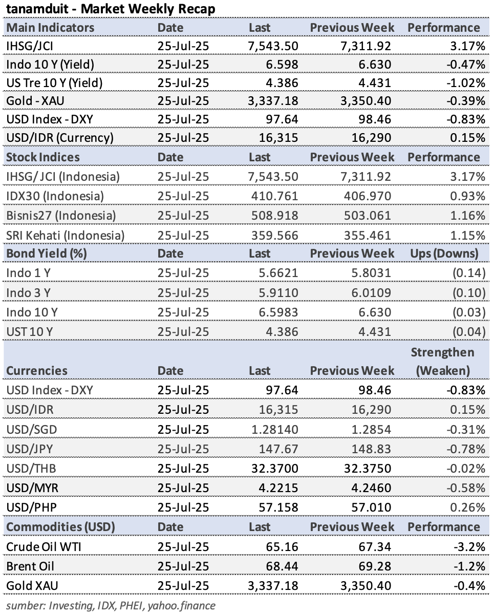 Berikut adalah rangkuman kinerja indeks saham, nilai tukar mata uang, harga komoditas, dan yield obligasi pada pekan 21-25 Juli 2025, beserta data kinerja terbaru per tanggal 25 Juli 2025.