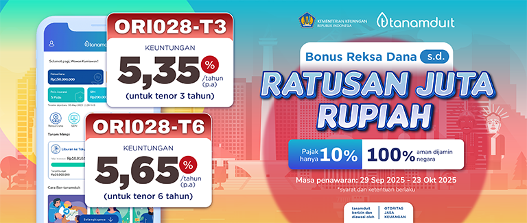 - Bonus promo ORI028 berupa voucher digital (pada Tier 1 – 3) yang dapat digunakan sebelum 30 hari dari diberikannya voucher digital pada semua produk reksa dana di tanamduit sesuai dengan ketentuan masing-masing minimum pembelian produk reksa dana.