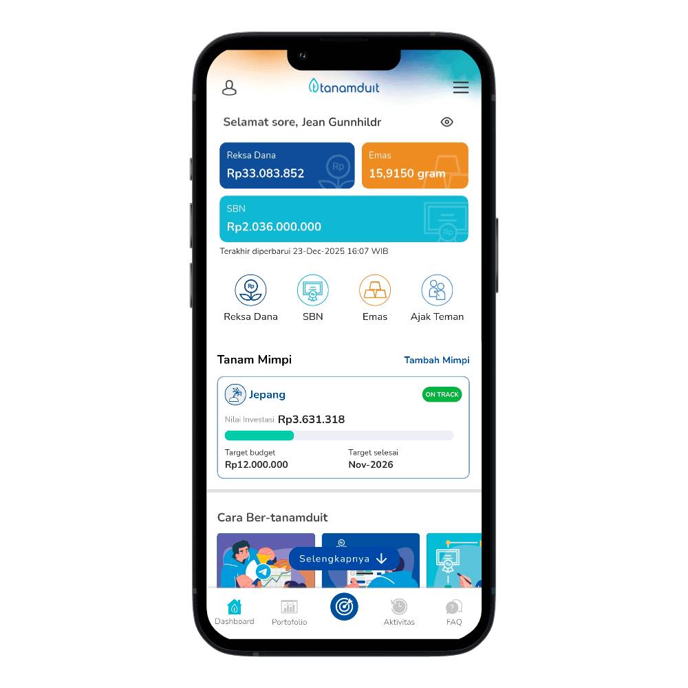 Penting untuk diperhatikan! Transaksi investasi reksa dana, Surat Berharga Negara (SBN), dan emas tanamduit hanya dapat dilakukan di aplikasi tanamduit. Pastikan tidak melakukan transaksi investasi di luar aplikasi tanamduit dan/ataupun melakukan transfer dana ke rekening atas nama pribadi. Jaga kerahasiaan data pribadi untuk menghindari penipuan mengatasnamakan tanamduit.