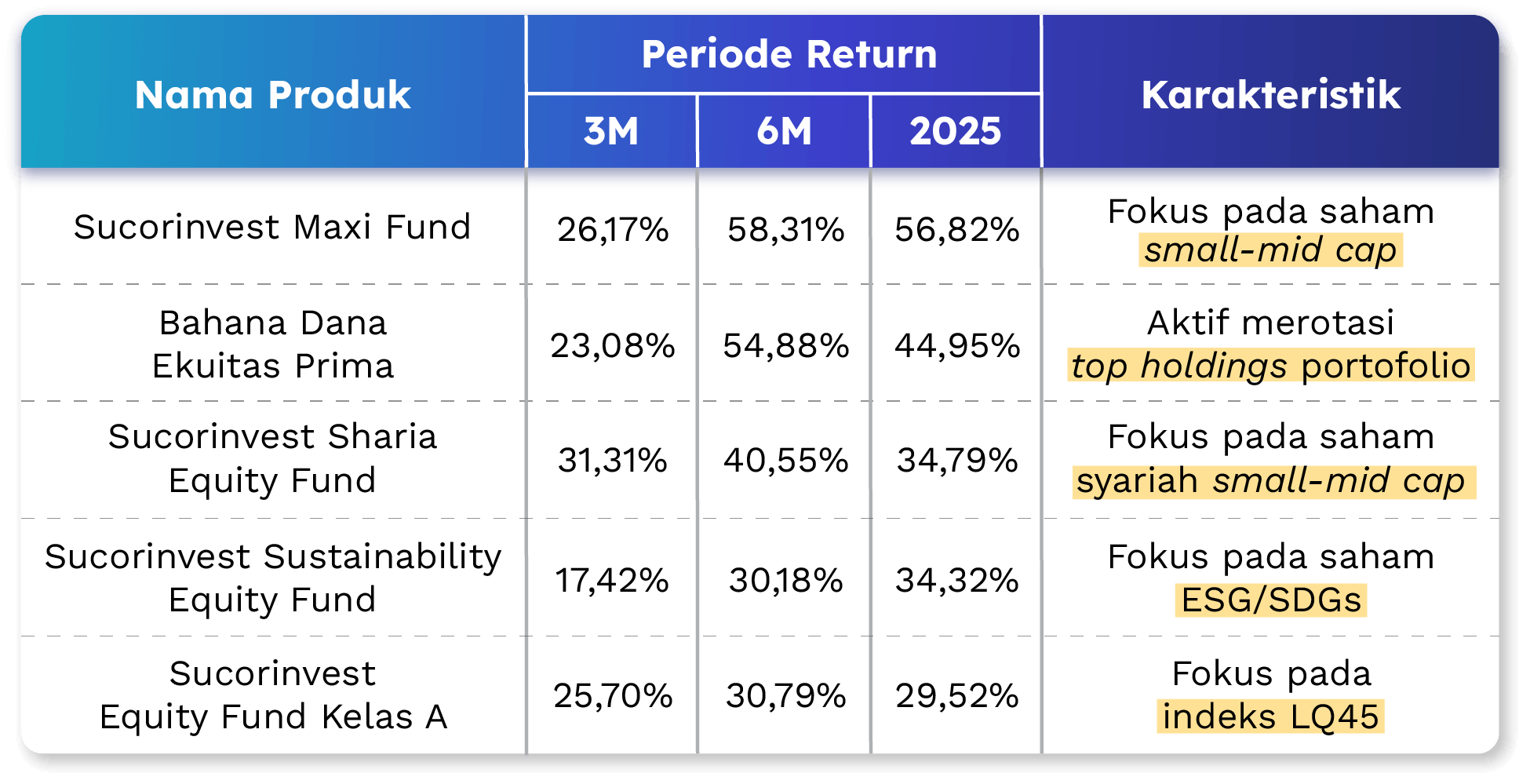 - Paling agresif dan alpha-seeking: Sucorinvest Maxi Fund