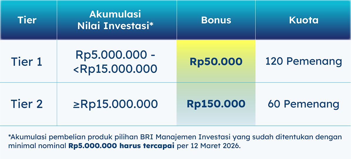 5. Bonus berupa unit penyertaan reksa dana BRI Seruni Pasar Uang III akan diberikan paling lambat pada tanggal 18 Juni 2026, jika nasabah tidak melakukan penjualan dari unit reksa dana yang dibelinya selama periode 11 Februari – 11 Juni 2026. Pemenang promo ditentukan berdasarkan transaksi terbesar dan tercepat.
